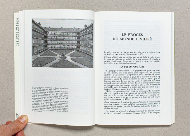 L’ouvrage permet de suivre Godin et ses positions sur le paupérisme, la condition ouvrière et salariale, la religion, la pensée libérale, la condition féminine, ainsi que sur le progrès, la liberté, la justice, le travail, l’internationalisme. On le suit dans sa grande idée de l’Association comme solution à la bonne répartition des richesses et garantie au droit à la protection sociale. Elle seule « constituera le remède aux plaies apparentes de notre progrès industriel » : « Effaçant l’individualisme, et l’égoïsme qui en est la conséquence, et qui pousse sans cesse l’homme au mépris du droit des autres, le principe de participation inspirera chacun de sentiments plus humains, sauvegardant les droits de tous. » En dépit d’un siècle et demi de bouleversements sociaux, le projet de république du travail développé par Godin garde aujourd’hui encore toute sa valeur d’espérance à réaliser.